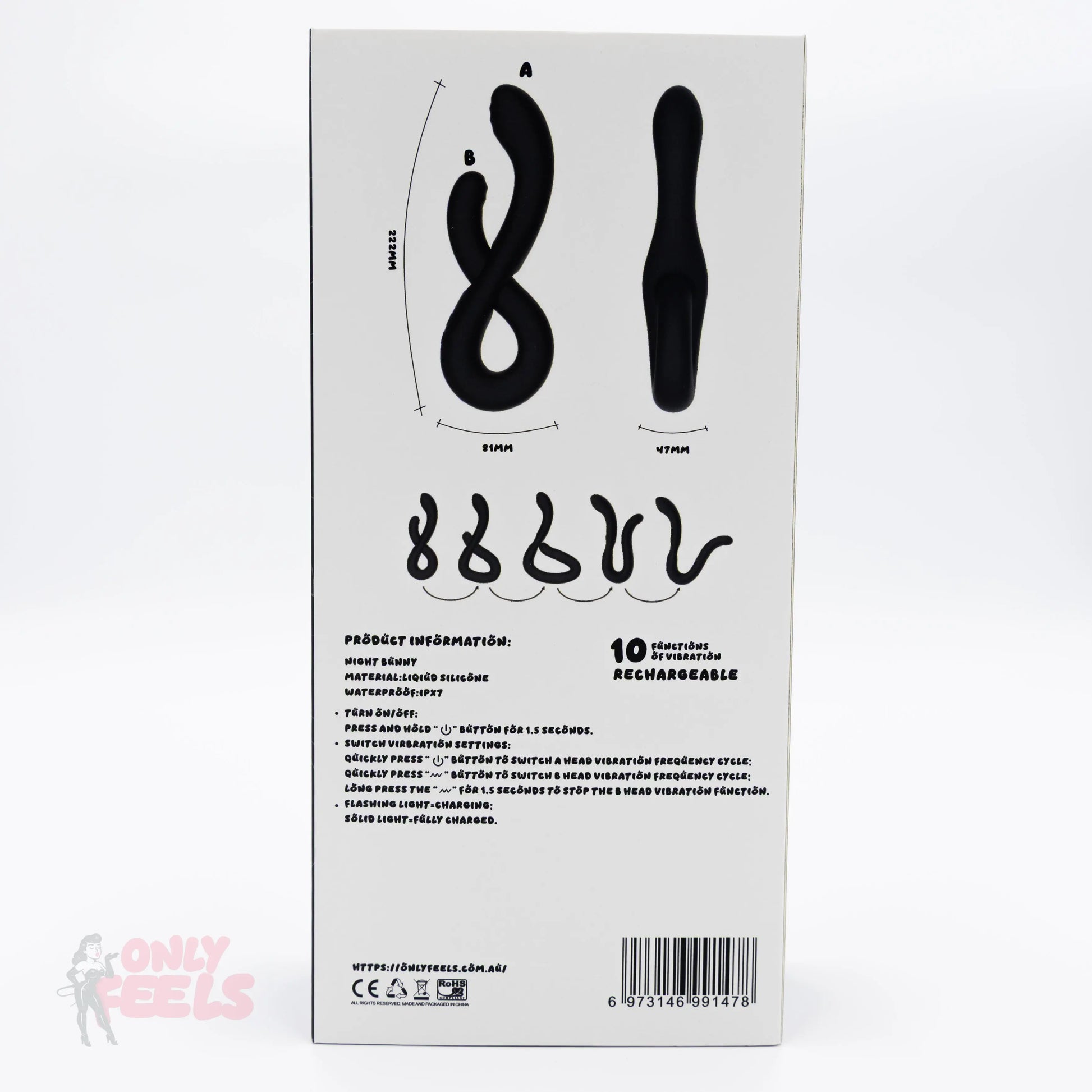 A clever cut-out design at the centre allows one end to pass through, transforming Night Bunny into a rabbit-style vibrator for solo use. Crafted from silky, body-safe liquid silicone, it’s smooth on sensitive skin, easy to clean, and fully waterproof for confident play anywhere.